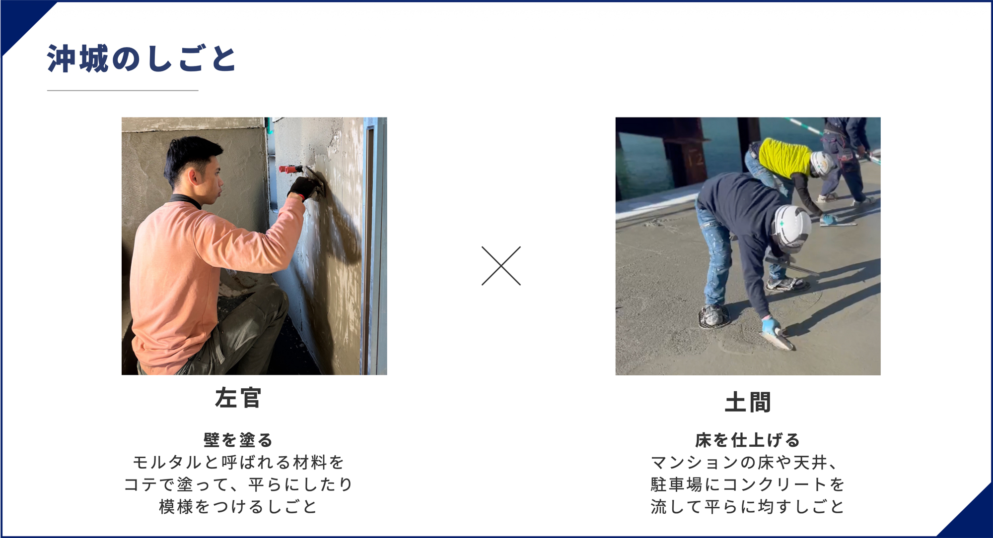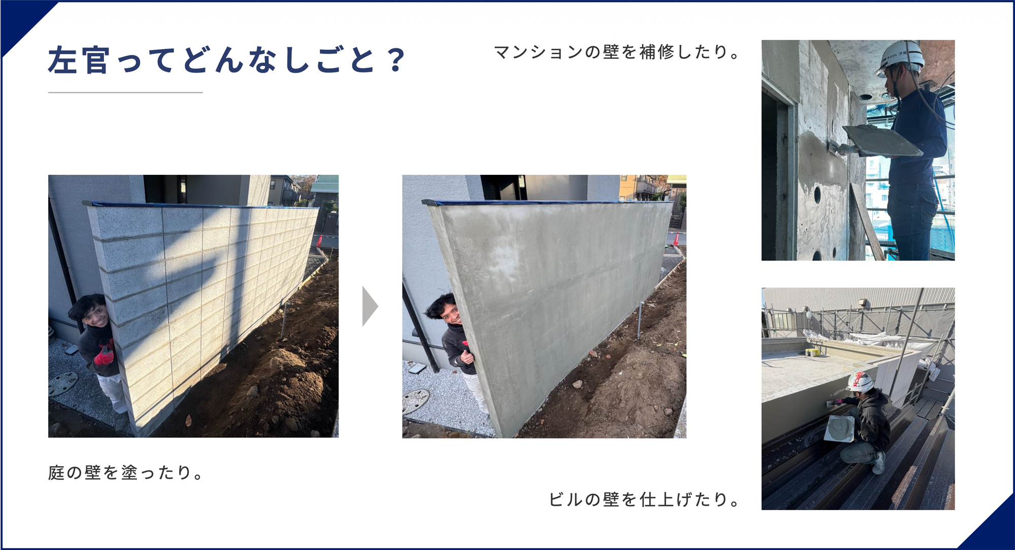左官とは、建築物の壁や床などを鏝(こて)という道具を用いて、塗って仕上げる職種です。材料として主にセメント、石膏、消石灰、土などに石や砂を混ぜ水で練ったものを使用します。使用する材料の利便性から、鉄鋼・鋼製建具・製作金物の固定、その周囲の壁や床面との取りあう部の美観調整も行います。